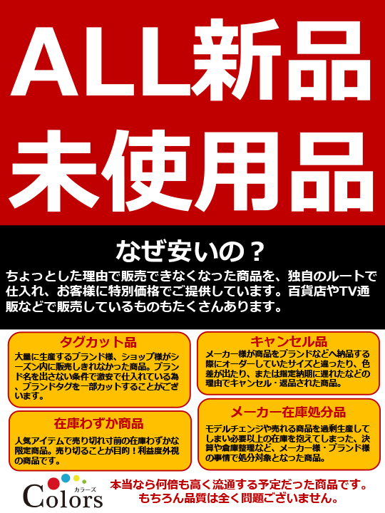 作りすぎた在庫品となったブランド品などをメーカー&工場から直接依頼を受け、仕入れた商品となります。